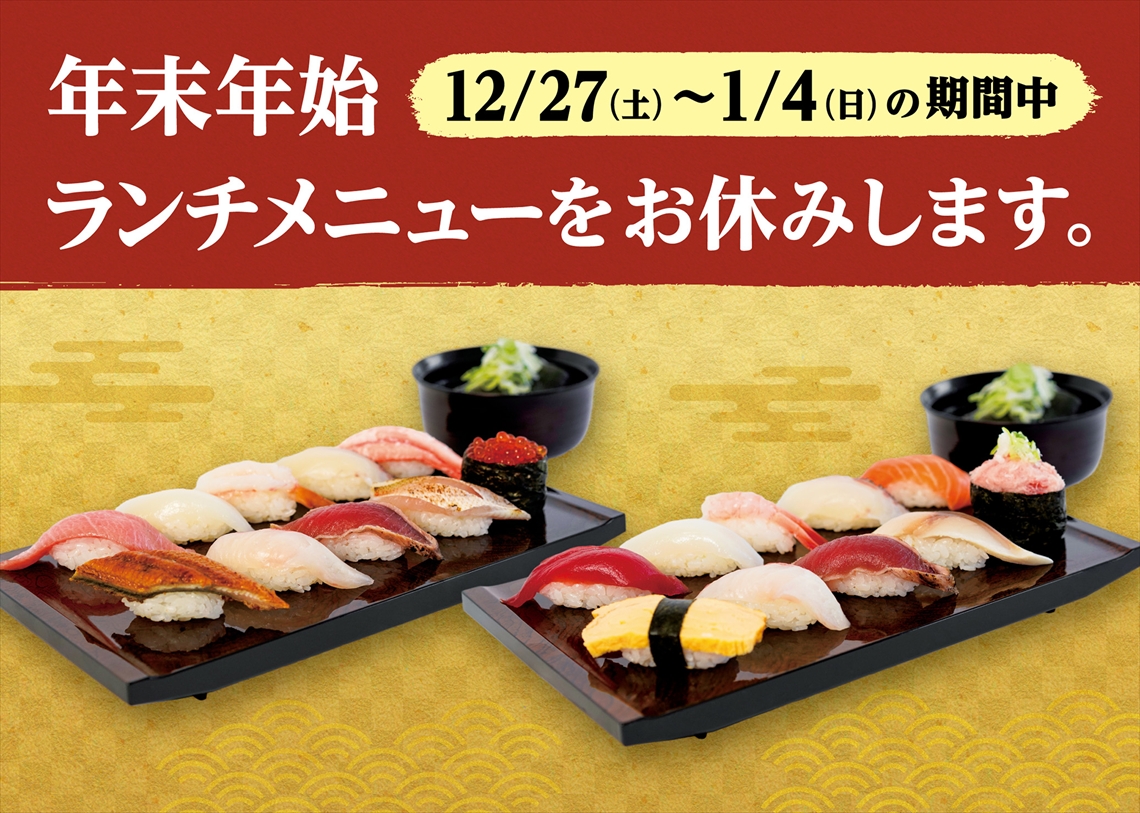 2025.11.27 お知らせ 年末年始期間中、ランチお休みします。 12月27日(土)~ 1月 4日(日)までの年末年始期間は、 全店でランチメニューをお休みさせて頂きます。誠に勝手ではございますが、何卒ご了承ください。